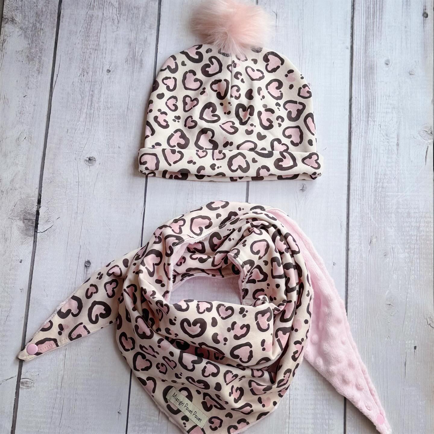 Foulard en jersey et minky rose, se ferme grâce à des pressions et est réversible
