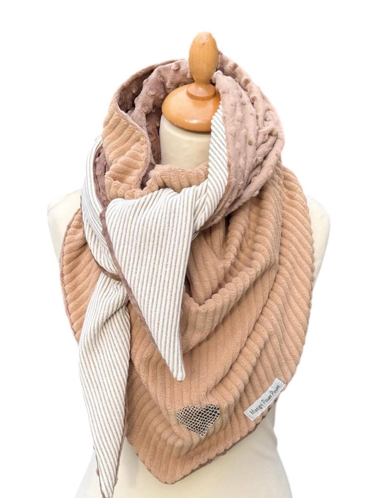 Foulard en verlours tout doux camel , pointes en jersey beige et doré et dos en minky, réversible, coeur en simili